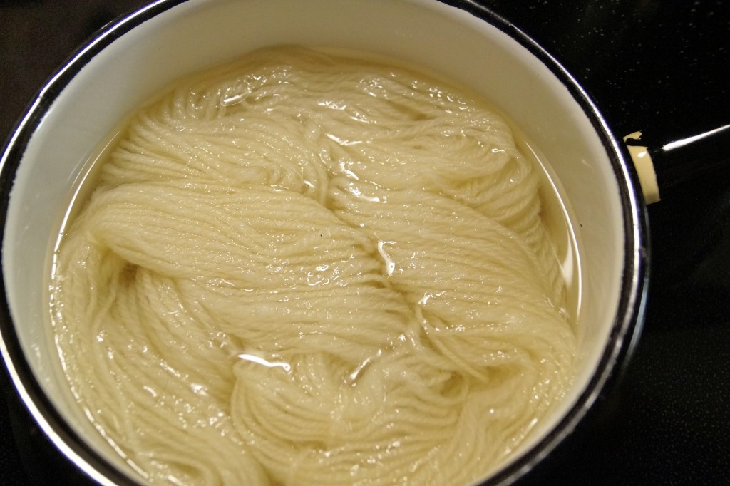 I used vinegar to mordant the wool as it was handy and seeing as I was up at the northern homestead, an exhausted alum dye bath isn’t to be sent into a septic system so I pretty much had no choice but to use the vinegar. I measured out one cup of plain, white vinegar to 4 cups of water. Place your yarn in the water, gently pressing it down to soak all the fibers, BUT, DO NOT STIR or AGITATE the fiber or it will felt.