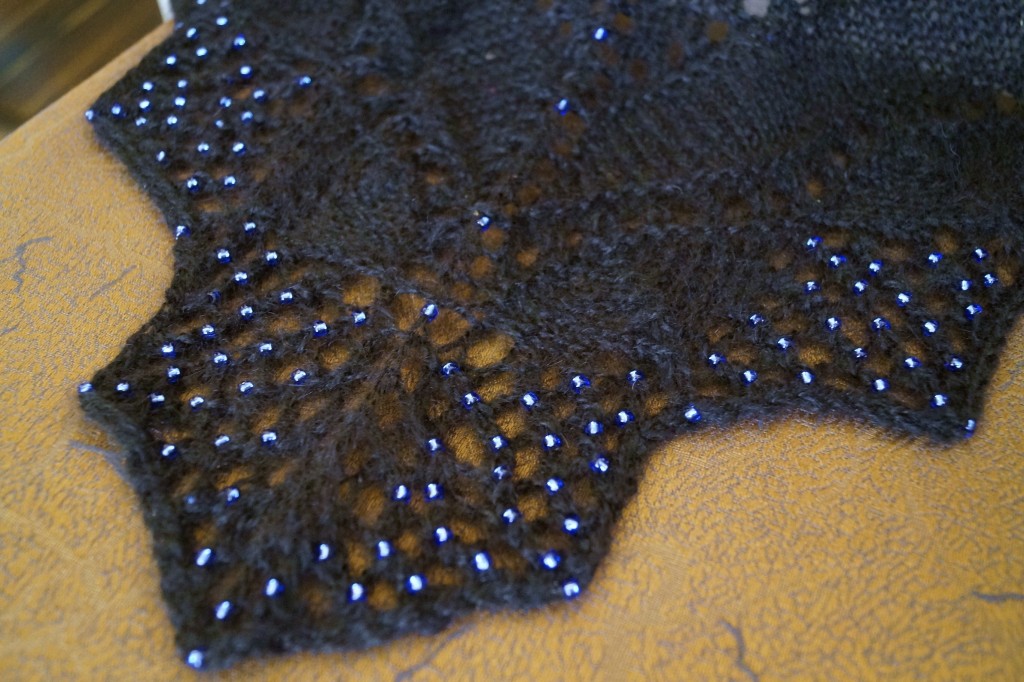 Once I settled on “what” to knit, it was time to look for the perfect pattern on Ravelry that would showcase the lovely fibre. It couldn’t be too complicated a stitch pattern as the black fibre would make any intricate stitch definition disappear, rendering it a total waste of time and energy, but I finally settled on a simple pattern with a scalloped lace edging featuring hundreds of tiny seed beads set in like iridescent blue stars against a jet black sky.