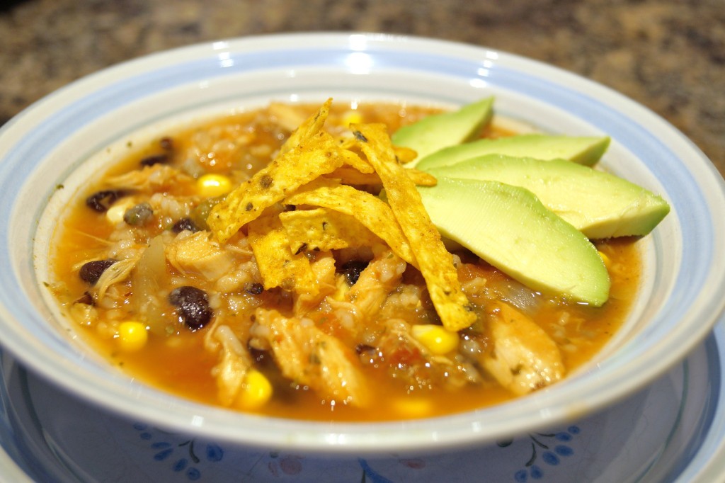 Stir to combine and let sit for 4-6 hours for the flavours to get happy. Garnish with tortilla strips and avocado slices.